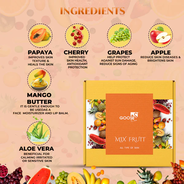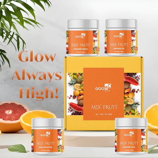 Goosecare Mix Fruit Massage Facial Kit is a 4-step skin care experience crafted with the nourishing power of papaya, grape, apple, and cherry extracts. From deep cleansing to hydration and glow enhancement, each step is designed to gently exfoliate, refresh, and reveal soft, radiant skin. With rich antioxidants and natural actives, this facial kit revives tired, dull complexions and brings a fruity freshness to your skincare routine.