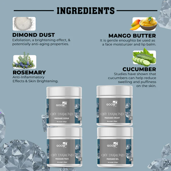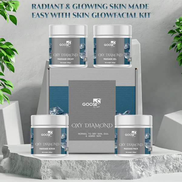 Goosecare Oxy Diamond Massage Facial Kit is a luxurious 4-step skincare solution formulated to detoxify, energize, and visibly brighten your skin. Powered by oxygen-boosting ingredients like rosemary and cucumber extracts combined with the illuminating effects of real diamond dust, it helps draw out impurities, refine texture, and revive dull skin. Perfect for all skin types craving a fresh, luminous look.
